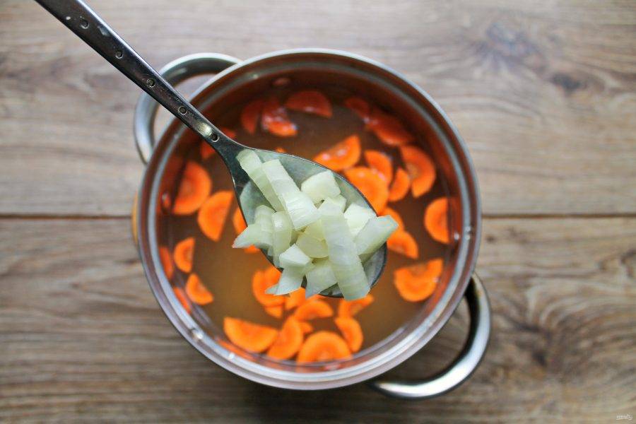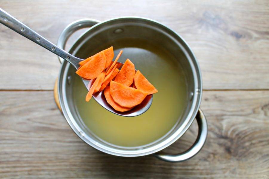 Морковь почистите, порежьте на дольки и выложите в бульон.