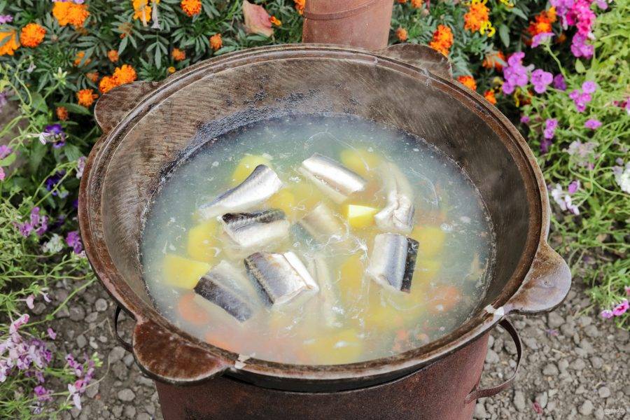 Уха из стерляди на костре готова. Накройте казан крышкой, снимите с огня и подождите 7-10 минут, чтобы блюдо настоялось.