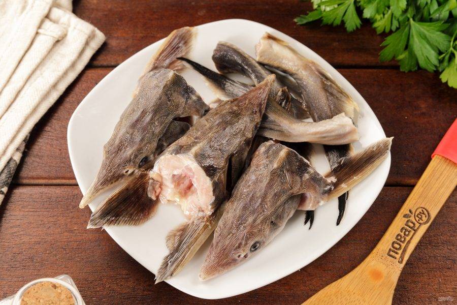 Отрежьте голову, хвост и плавники у рыбы. Это у нас пойдёт в бульон. Обязательно из головы удалите жабры.