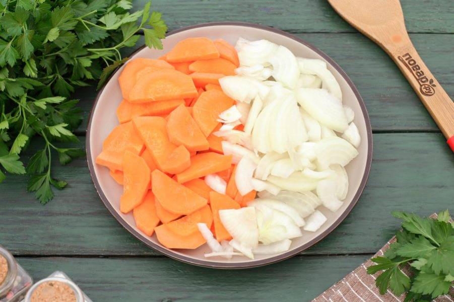 Морковь и лук нарежьте произвольно, но тоже не слишком мелко.