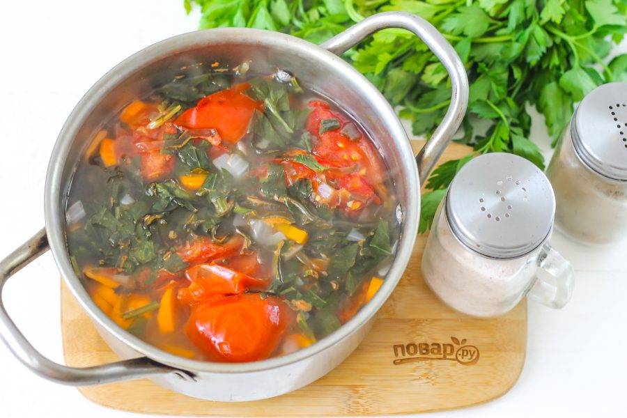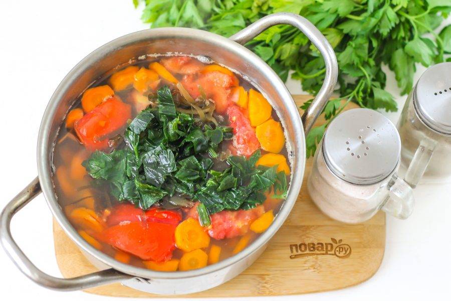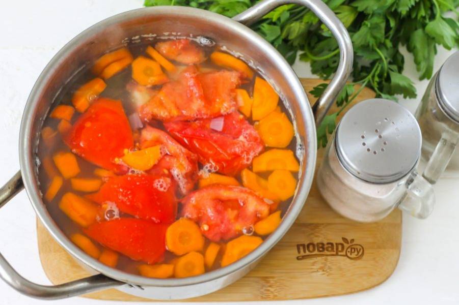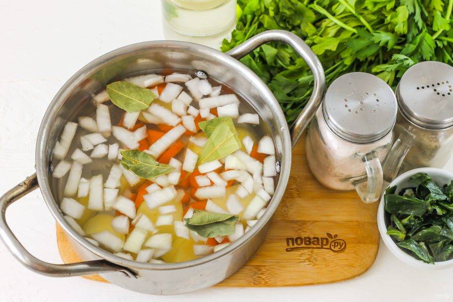 Посолите и поперчите первое, отварите примерно 1-2 минуты. По желанию можно добавить и зубчик чеснока, очистив и нарезав его слайсами.