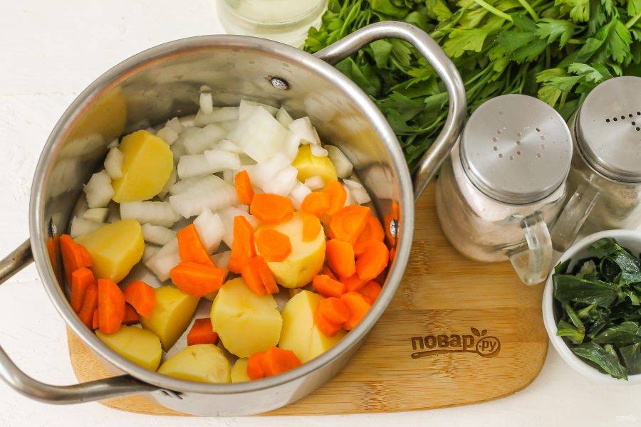 Морковь нарежьте полукольцами, лук — мелкими кубиками, а картофель — средними кубиками. Добавьте все нарезки в кастрюлю или казан.