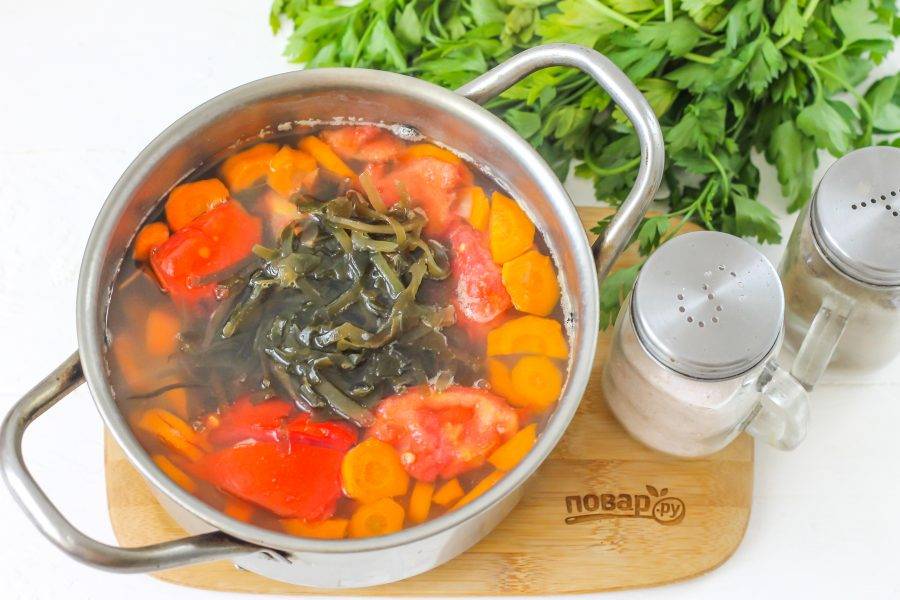 Выложите в емкость морскую капусту, отцедив ее от маринада.