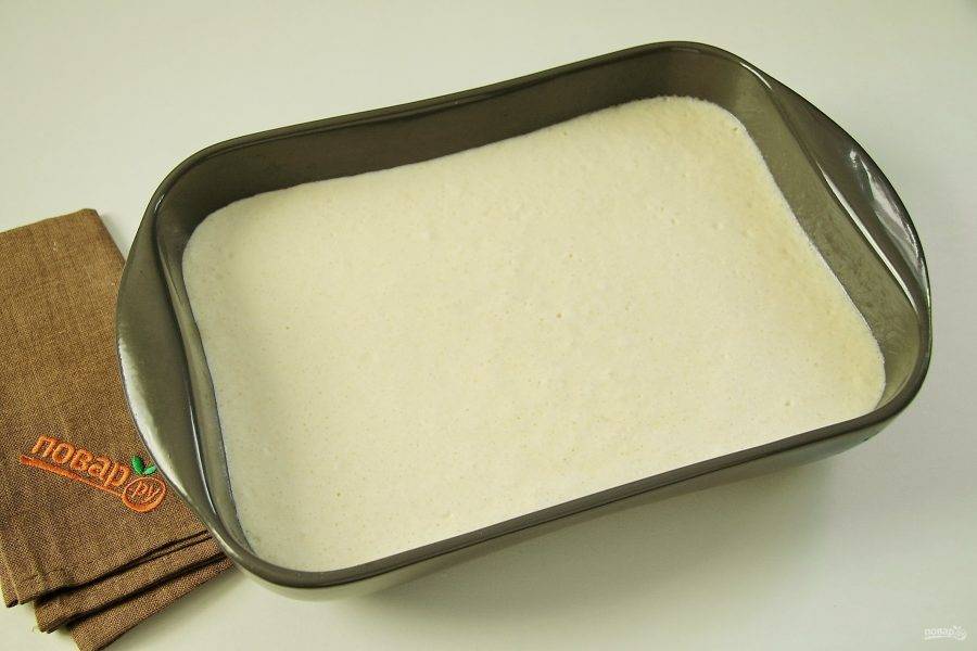 Перемешайте все ложкой до однородности. Тесто должно получиться достаточно жидкое, по консистенции как кефир.