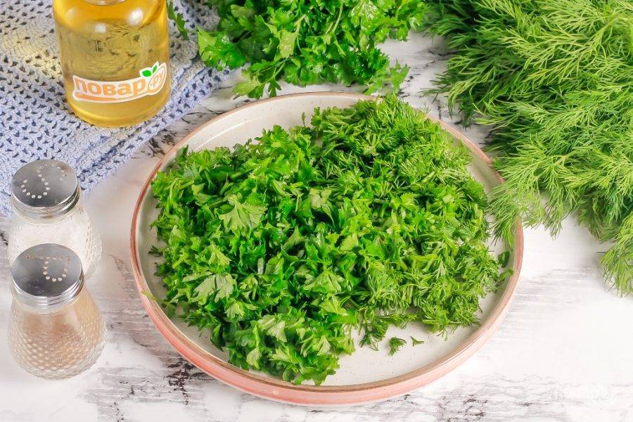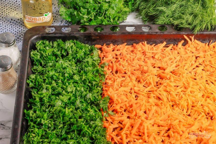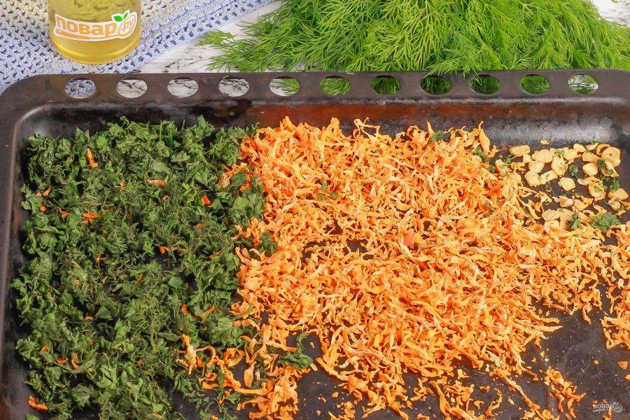 Зелень укропа и петрушки нарежьте мелко. Можно использовать и зелень сельдерея, зеленого лука, чеснока и т.д. Но только не используйте репчатый лук, он будет влажным даже после сушки.