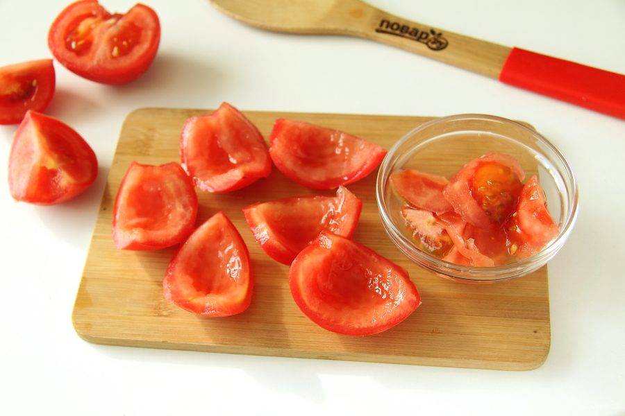 Помидоры помойте, разрежьте на 4 части и удалите мякоть с семенами. Мякоть можете использовать в салатах или для приготовления подливы и соуса.