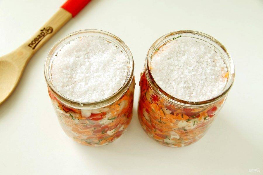 После того, как банки будут заполнены, сверху насыпьте еще немного соли для лучшего сохранения овощей. Универсальная заправка на зиму готова.