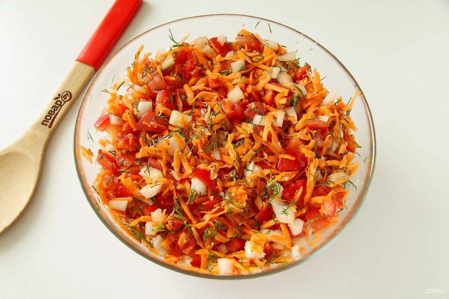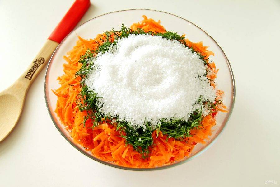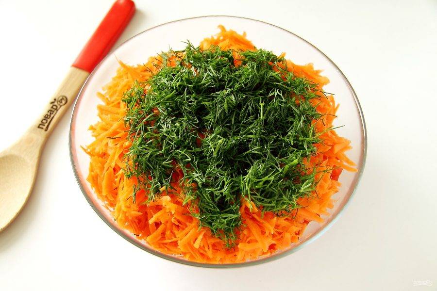 Морковь натрите на терке, зелень помойте и измельчите ножом. Зелень можно использовать любую сезонную, такую как петрушка, укроп или кинза.