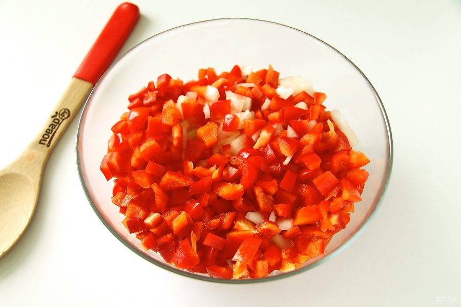 Нарежьте помидоры кубиками. Добавьте очищенный от семян перец, который так же необходимо нарезать кубиками и нарезанный такими же кубиками лук.
