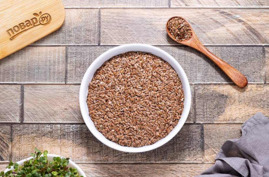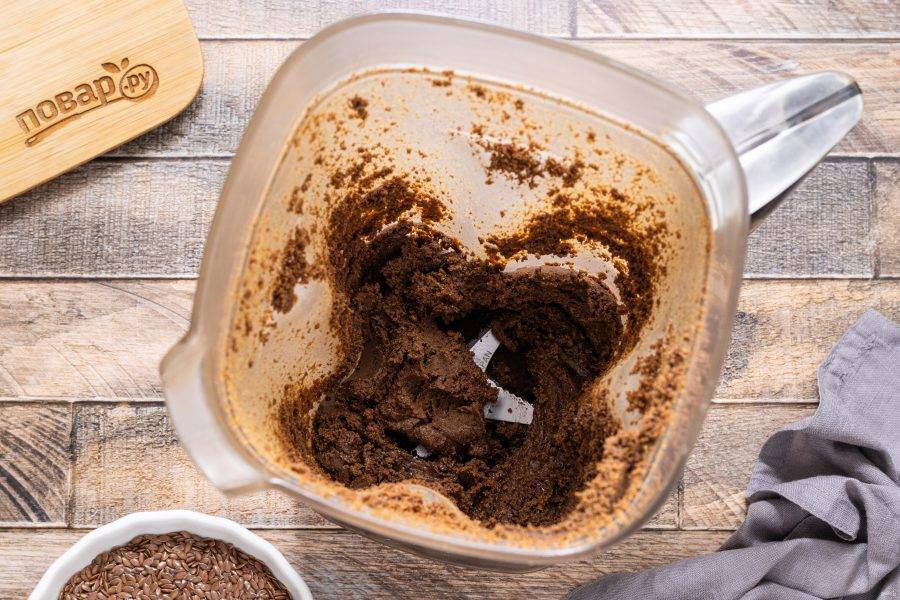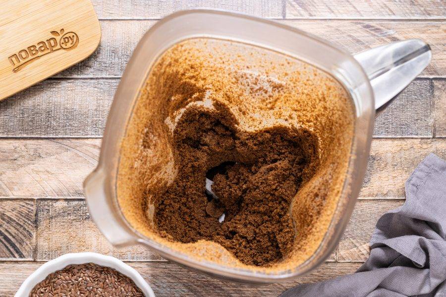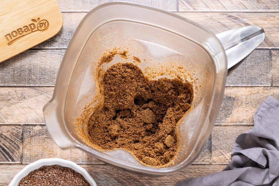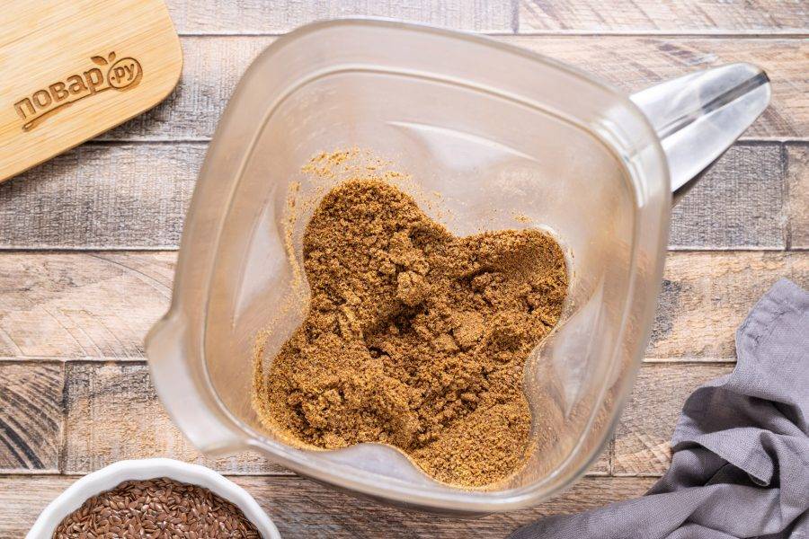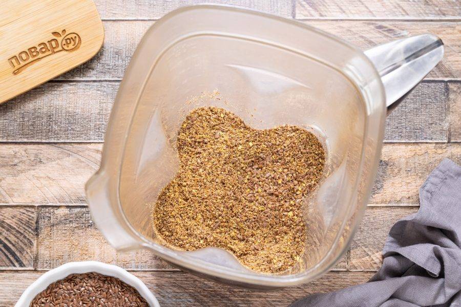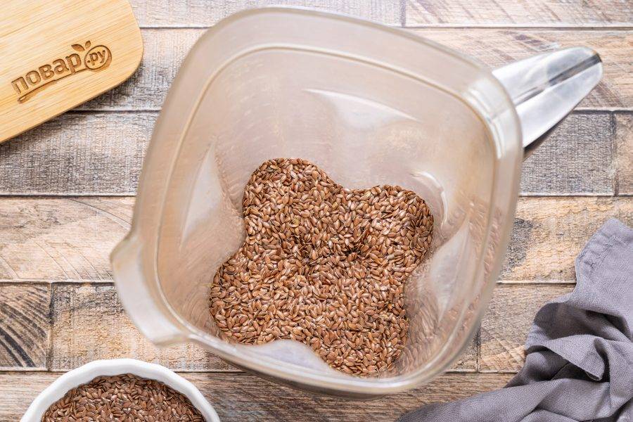 Льняные семечки переложите в чашу блендера. Чтобы облегчить процесс измельчения, их можно предварительно немного подогреть в скороде, но не жарить.