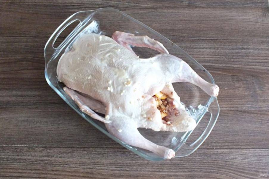 Утку начините начинкой. Края кожи, чтобы не выпала начинка, стяните шпажками или зашейте кулинарной нитью.