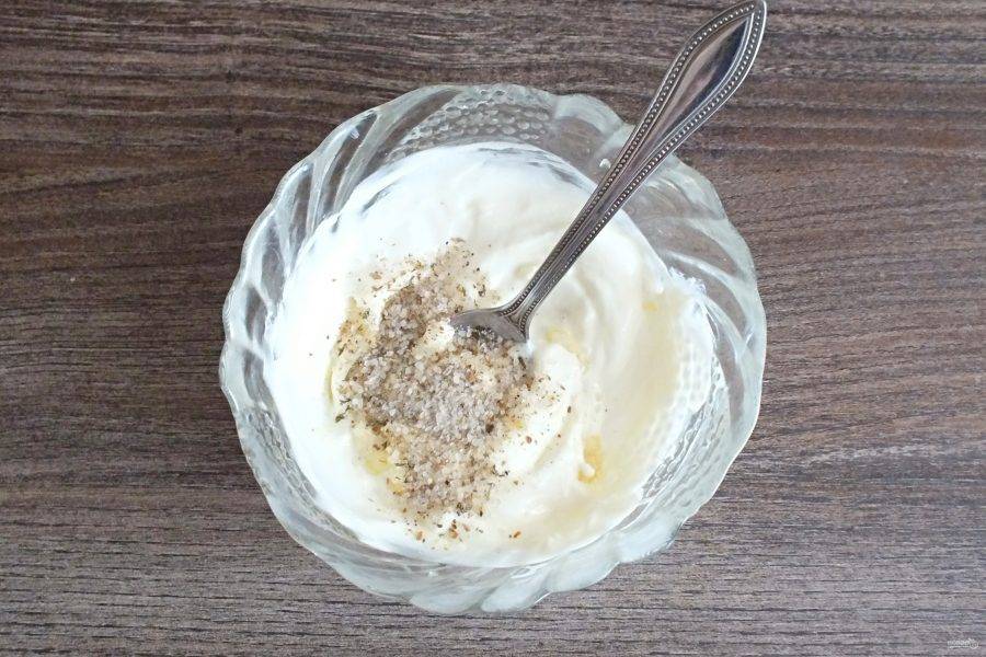 Подготовьте намазку для утки. Смешайте сметану, измельченный чеснок, соль и специи.