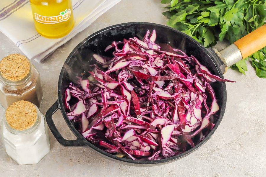 Пока лук обжаривается, нарежьте красную капусту не тонкими лентами. Добавьте в сковороду и перемешайте. Влейте 50 мл. горячей воды, всыпьте 2 щепотки соли и потушите все на умеренном нагреве примерно 15 минут до мягкости капустной нарезки. Желательно накрыть сковороду крышкой при тушении.