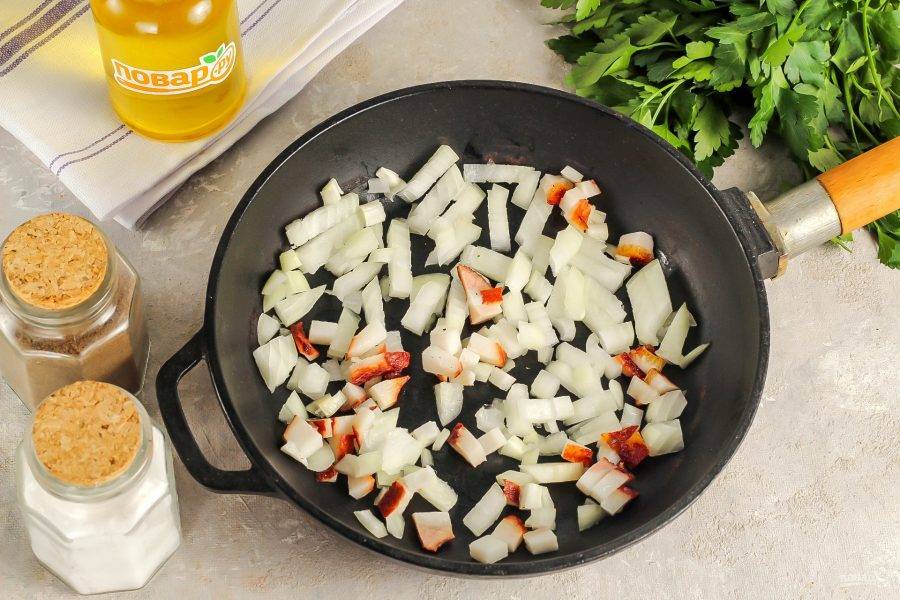 Сало нарежьте мелкими кубиками. Очистите репчатый лук от кожуры, промойте и также нарежьте мелкими кубиками. Влейте в сковороду растительное масло и прогрейте на плите. Всыпьте луковую нарезку и нарезку сала. Поджарьте на среднем нагреве примерно 5-6 минут до румяности, не забывая перемешивать.