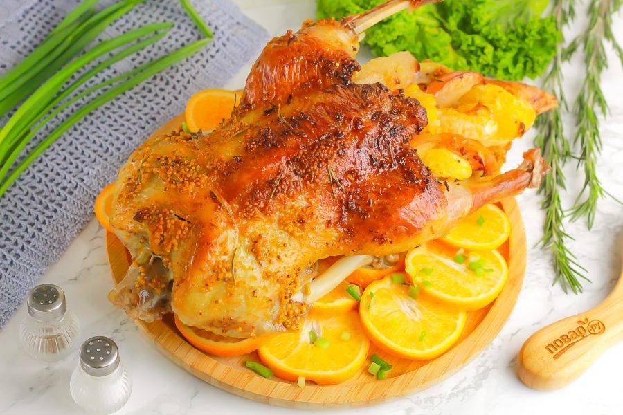 Вытопившийся жир слейте в банку или контейнер и охладите, храните на холоде — на нем можно жарить любые продукты, добавлять его в каши, макароны. Готовую красочную утку выложите на апельсины или на листовой салат на блюде и подайте к столу горячей. Приятного вам аппетита!