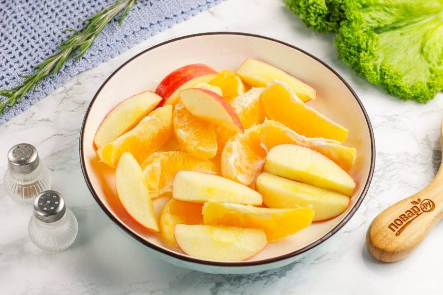 Очистите апельсин от оставшейся кожуры, разделите его на дольки. Яблоко разрежьте на части и вырежьте семенные блоки. Нарежьте мякоть крупными ломтиками. Если утка крупная, то используйте 2-3 яблока.
