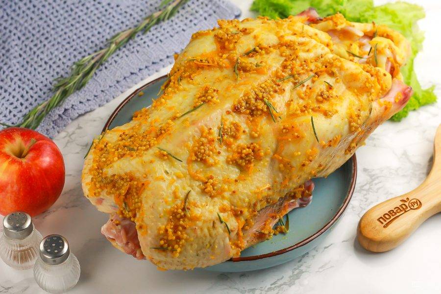 Снаружи и внутри обмажьте тушку утки приготовленной массой и оставьте при комнатной температуре на 1-2 часа.