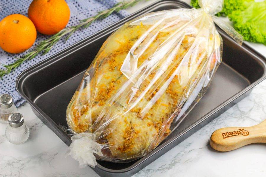 Разверните рукав и поместите в него утку, завязав края. Разогрейте духовку до 200 градусов и поместите в ее середину противень с уткой. Запекайте 1 час, а затем нагрев убавьте до 180 и запекайте еще 1 час. Время приготовления утки пропорционально ее весу, тушка в 2 кг. готовится 2 часа.