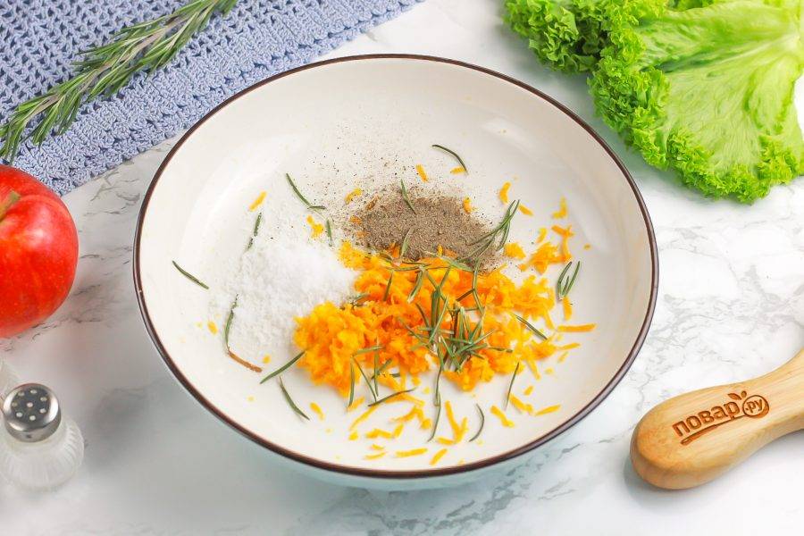 Ошпарьте апельсин кипятком и натрите цедру с цитрусового в глубокую емкость. Туда же высыпьте соль, молотый черный перец и нарвите листочки розмарина. Добавьте горчицу в зернах и перемешайте. Если горчица без масла, то влейте немного растительного масла в емкость.