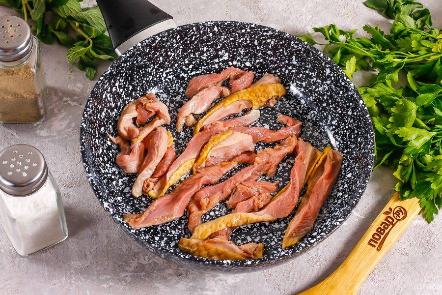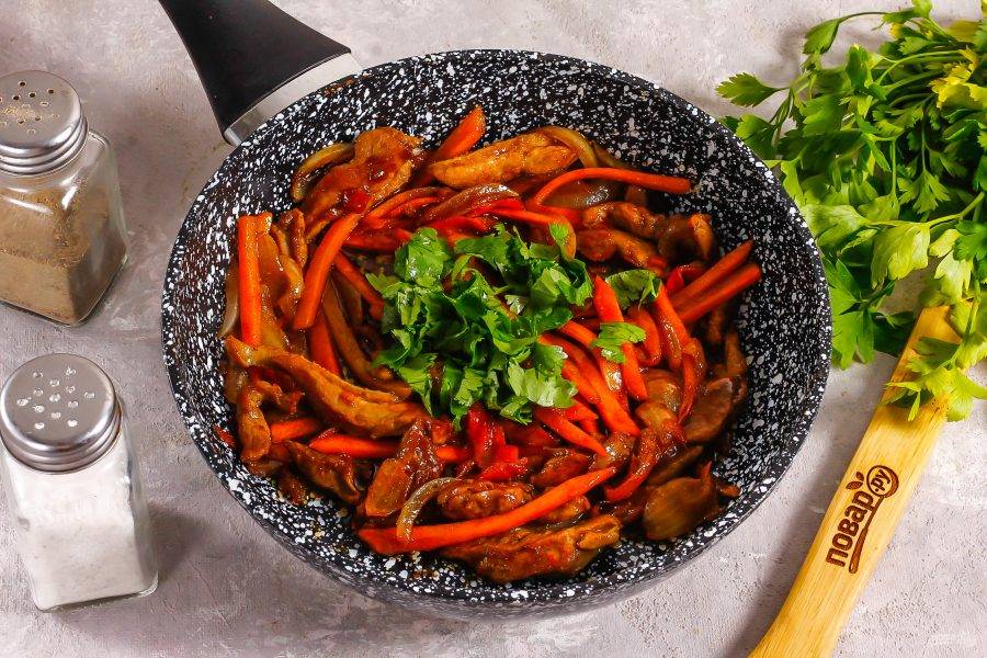 Нарежьте ее лентами или брусочками. Раскалите в глубокой сковороде растительное масло без запаха. Если у вас есть сковорода вок, то лучше используйте ее. Выложите утиное мясо и поджарьте около 1-2 минут. Помните, что жарить продукты нужно очень быстро, иначе мясо станет плотным и жестким.