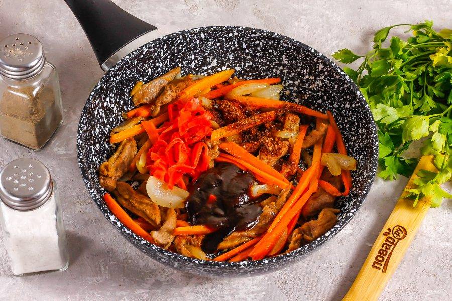 Добавьте все остальные продукты: специи и соусы, имбирь, соль. Аккуратно перемешайте и томите около 1 минуты.