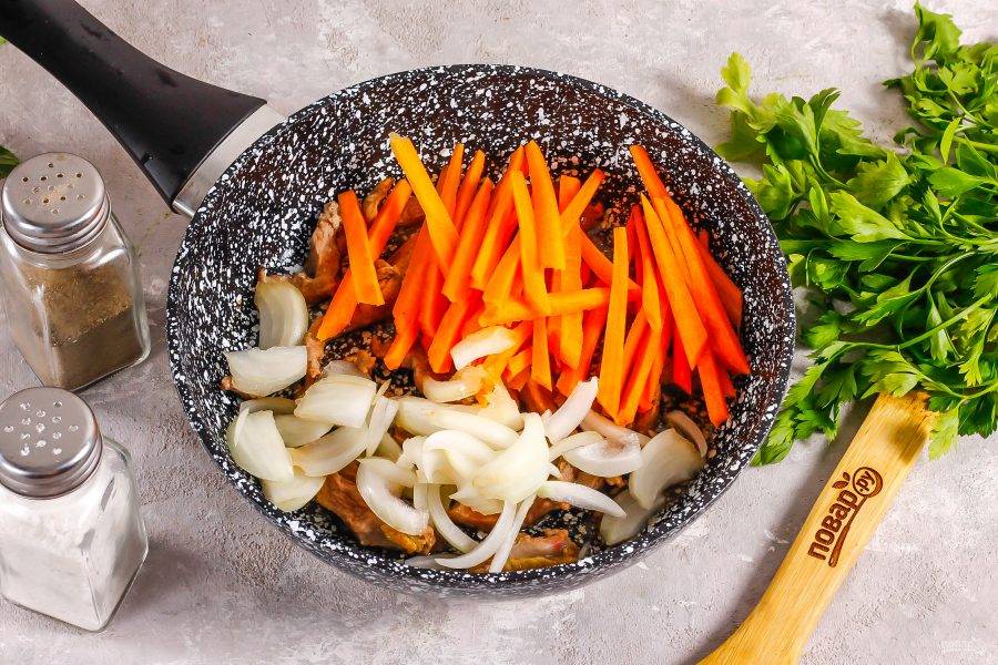 Затем сразу же выложите в сковороду овощные нарезки и перемешайте. Обжаривайте примерно 2-3 минуты.