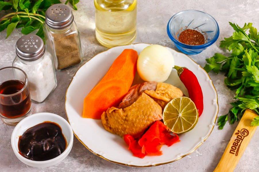 Подготовьте указанные ингредиенты. Утиную грудку промойте в воде и обсушите. Заранее очистите морковь и лук от кожуры, промойте в воде и нарежьте брусочками или перьями.