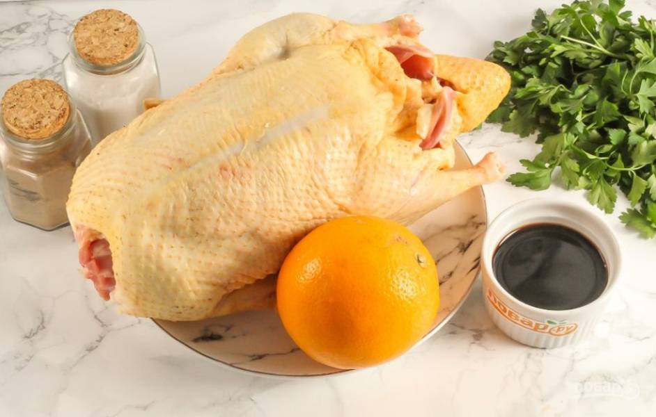 Подготовьте указанные ингредиенты. Утку промойте и обсушите бумажными салфетками. Если апельсины не крупные, то используйте несколько плодов.
