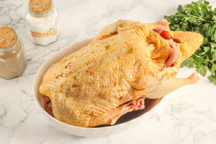Соедините в пиале или креманке соевый соус, соль и молотый черный перец. По желанию можете добавить и другие приправы, специи, но не крупного помола, иначе они подгорят. Натрите утку соусом внутри и снаружи. Желательно оставить тушку в соусе за 2-3 часа до начала запекания, если у вас есть свободное время.