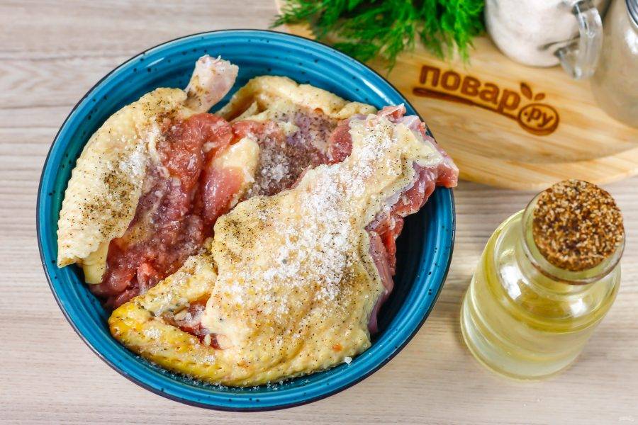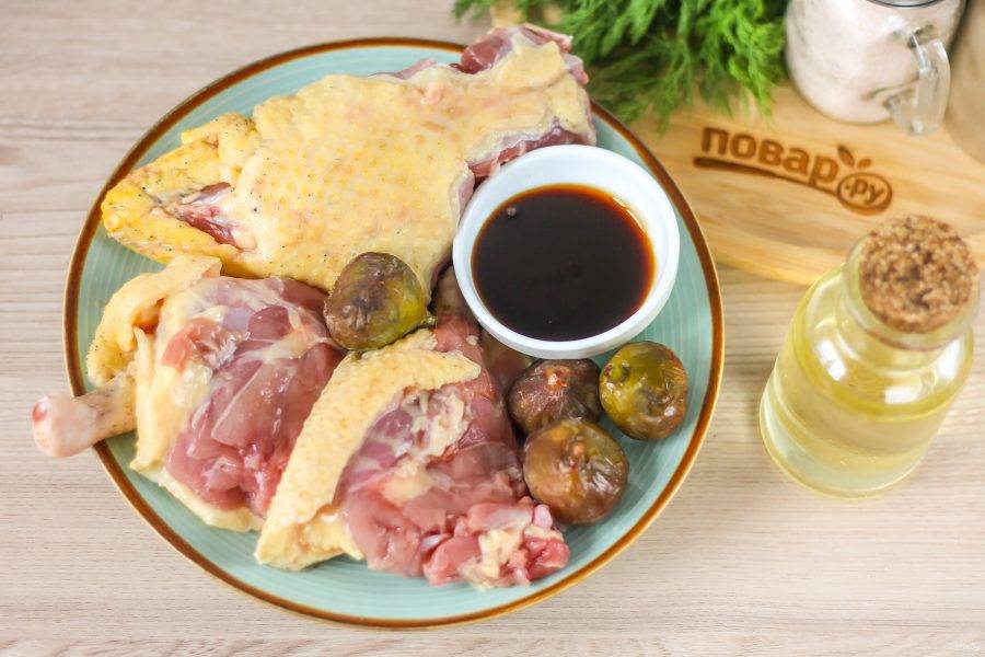 Подготовьте указанные ингредиенты. Утку промойте в воде, разрежьте на части и слегка просушите их бумажным полотенцем.