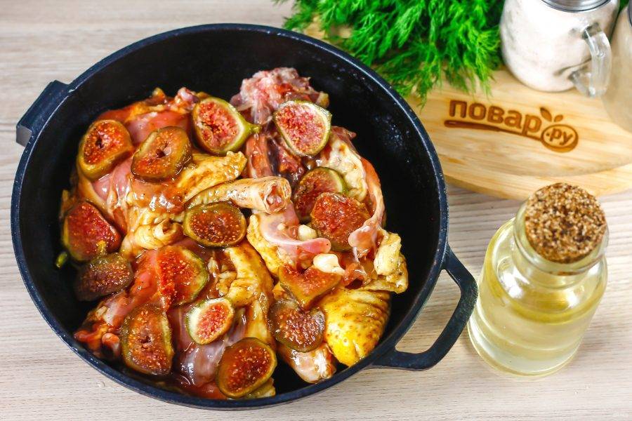 Выложите части утки в форму для запекания. Нарежьте инжир ломтиками или кружочками и разместите сверху. Влейте в форму 100 мл. горячей воды.