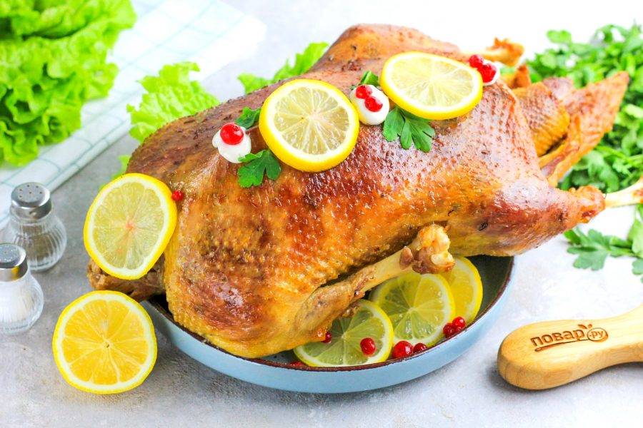 Выложите горячую птицу на тарелку, блюдо и украсьте лимонами, ягодами, соусом. Подайте к столу горячей. Приятного вам аппетита!
