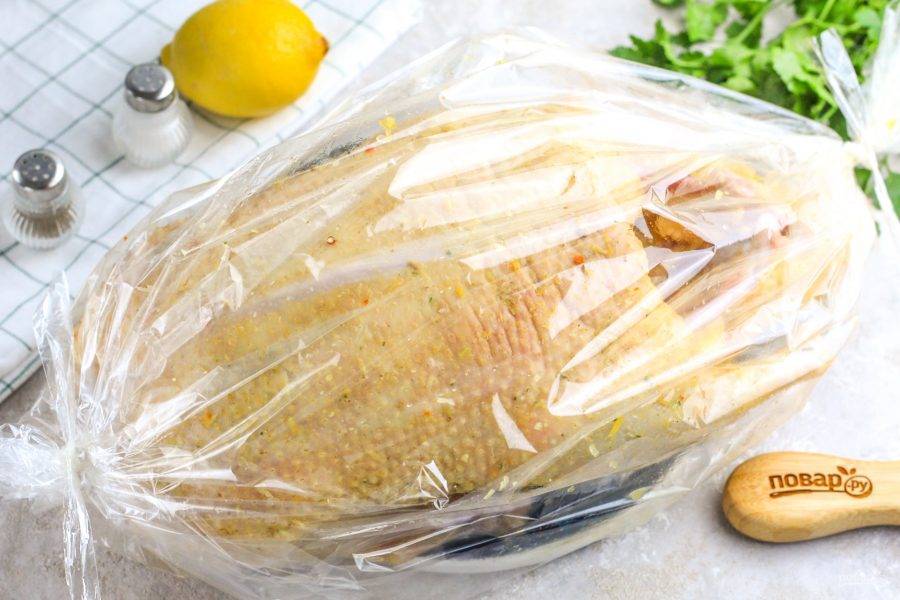 Поместите тушку в рукав для запекания и отправьте в духовку на средний ярус. Разогрейте ее до 180 градусов и запекайте не менее 2 часов — по весу тушки.