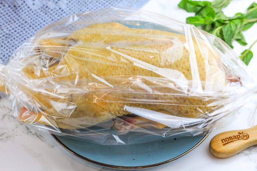 Разогрейте духовку до 180 градусов и поместите утку в рукав. Плотно завяжите обе стороны рукава, чтобы пар не выходил. Выложите утку в рукаве на противень и поместите в духовку.
