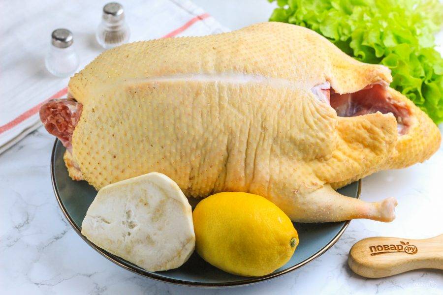 Подготовьте указанные ингредиенты. Тушку утки промойте внутри и снаружи, подсушите бумажными салфетками. Очистите корень сельдерея, промойте и разрежьте пополам, используйте половину.