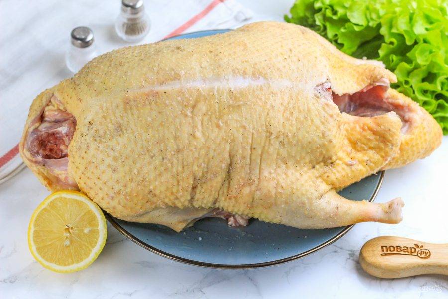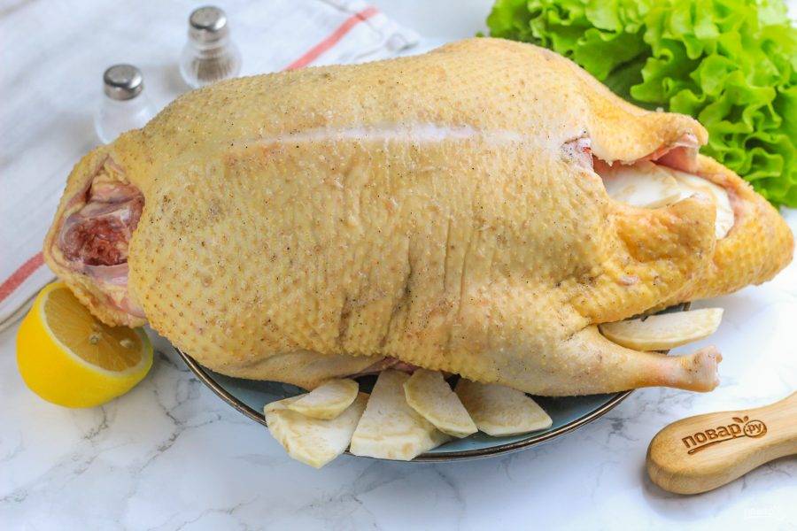 Перемешайте соль с молотым черным перцем и натрите тушку внутри и снаружи. По желанию можете добавить приправу для курицы или другие специи, пряности. Крупно нарежьте сельдерей и поместите его в тушку. В таком виде оставьте утку мариноваться минимум на 1-2 часа при комнатной температуре.
