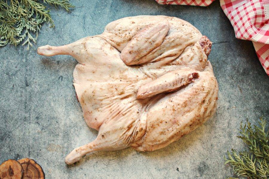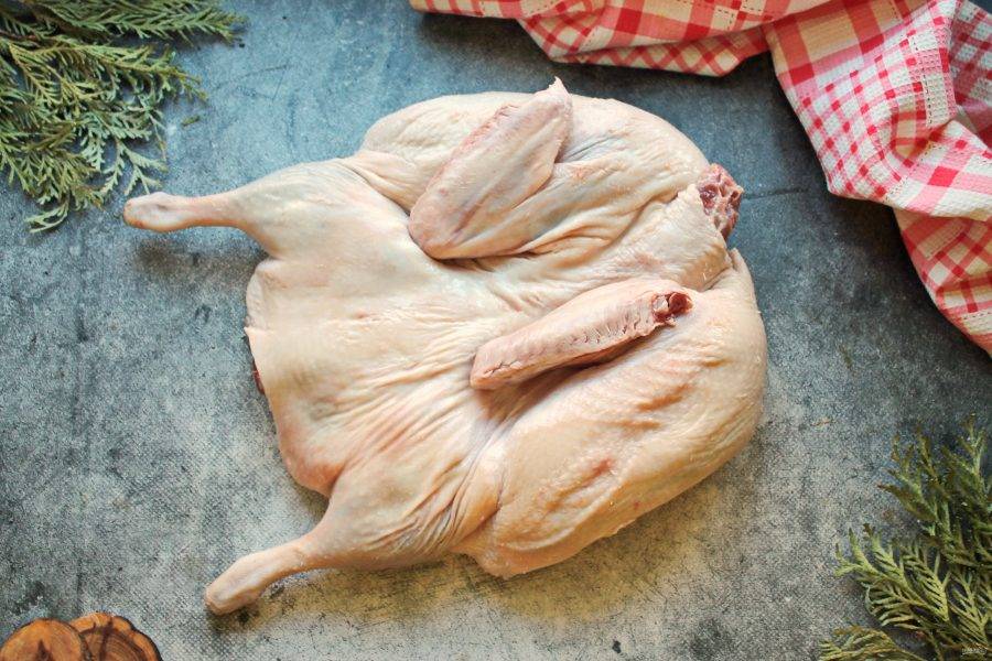 Утку разрежьте по грудке и раскройте. Отрежьте крайние фаланги крыльев и хвостик. Покройте птицу пленкой и немного отбейте кухонным молоточком с двух сторон.