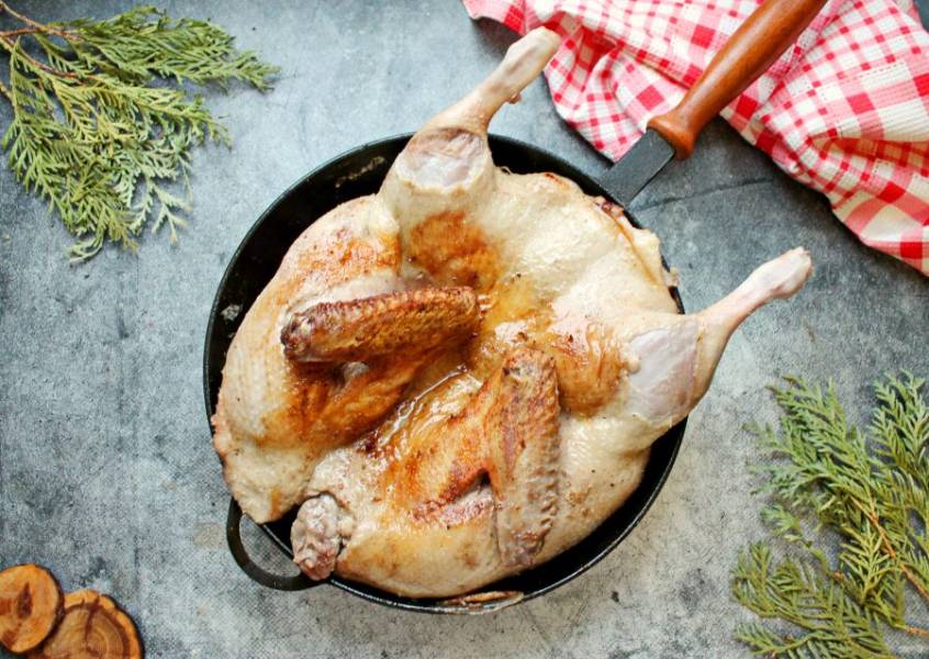 Большую чугунную сковороду разогрейте на среднем огне и выложите утку. Обжаривайте птицу с двух сторон до румяной корочки, придавив сверху грузом.