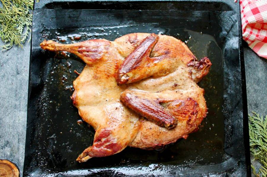 Противень застелите пергаментом или ковриком для выпечки и положите обжаренную утку разрезом вниз. Установите сверху груз и поставьте противень в горячую духовку. Запекайте утку табака при температуре 180 градусов в течение 40-60 минут. Готовую утку переложите на блюдо и сразу подавайте к столу.