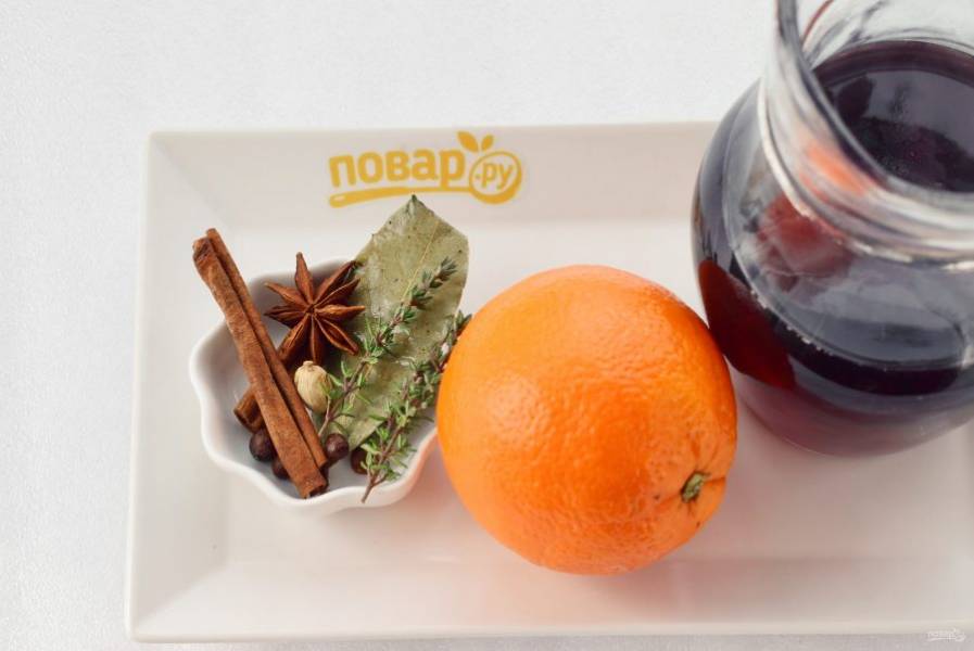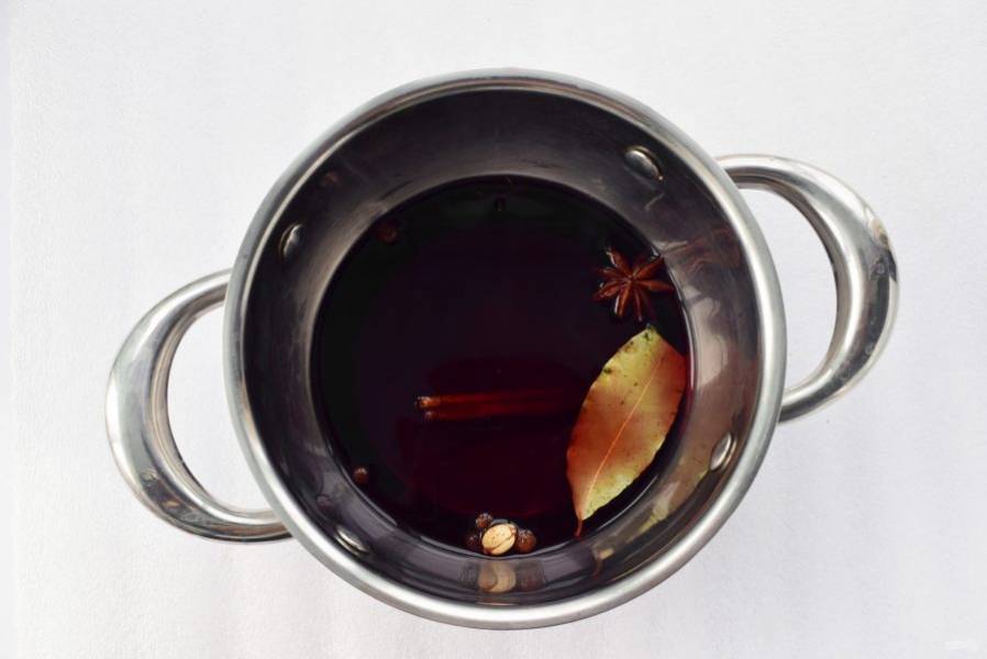 Влейте вино в кастрюльку, добавьте все остальные ингредиенты для глинтвейна. Нагрейте до 80 °С , остудите до комнатной температуры.