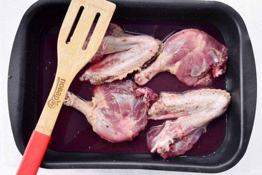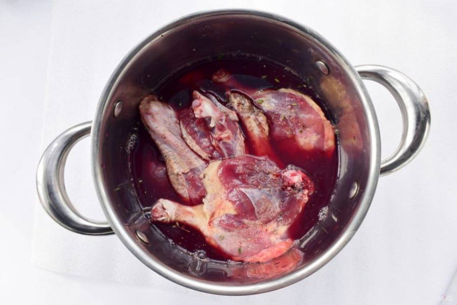 Утиное мясо залейте остывшим глинтвейном, оставьте мариноваться на несколько часов, можно на ночь.
