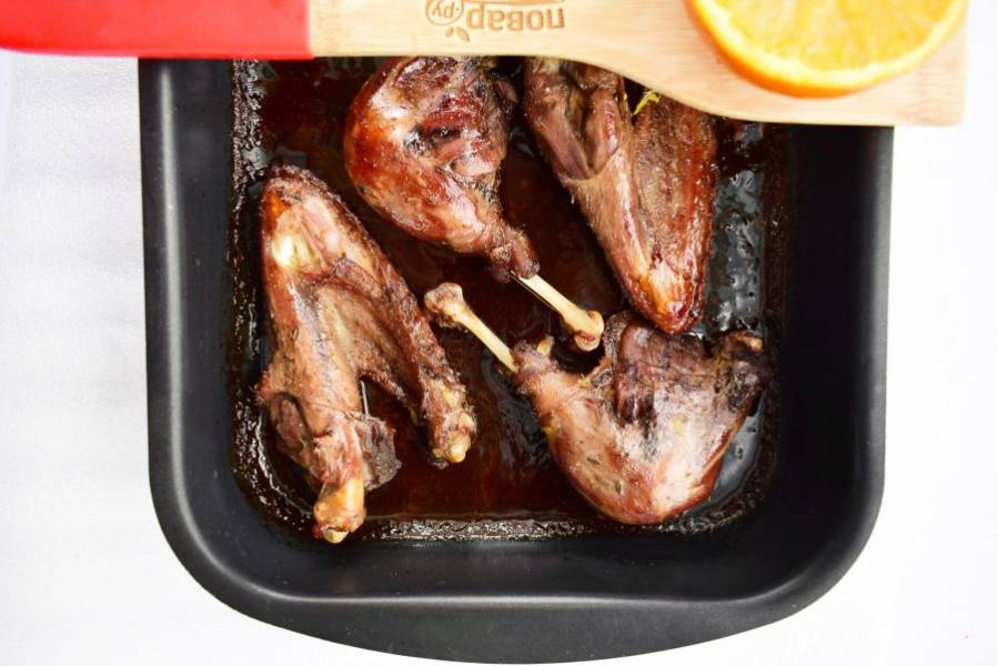 Полейте апельсиновым соком, когда маринад выпарится наполовину, и запекайте еще 15 минут.