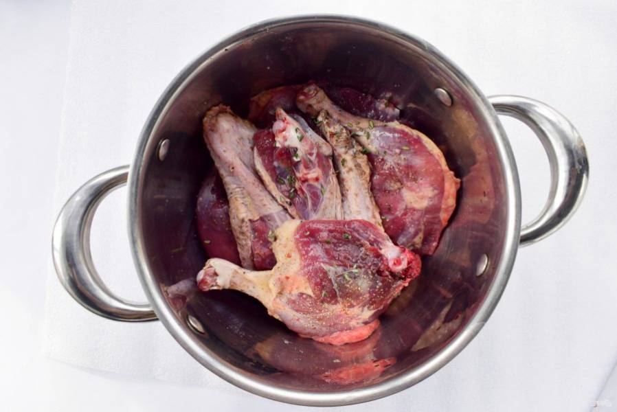 Утиное мясо промойте, обсушите, натрите солью, перцем и присыпьте измельченным свежим чабрецом (или тимьяном).