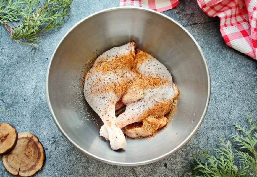 Куриные ножки сполосните и обсушите. Утку посолите, поперчите и посыпьте сухой аджикой. Все хорошо перемешайте.
