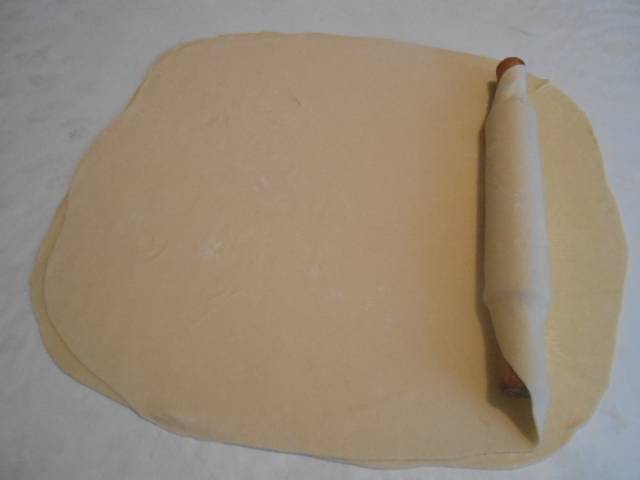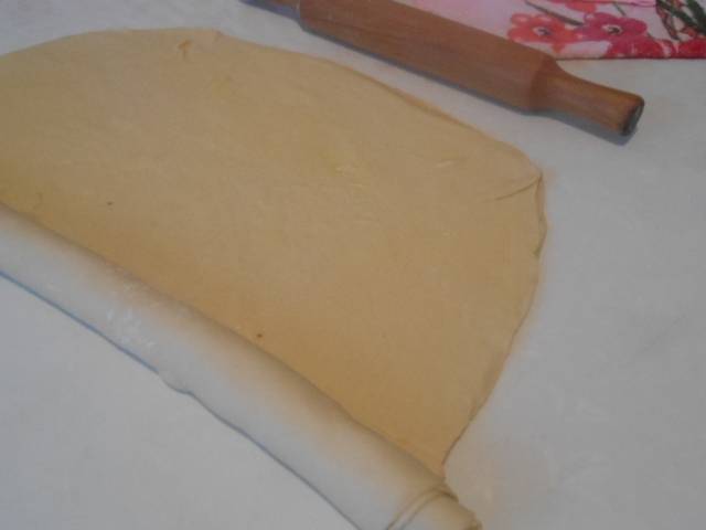 На др.столе раскатать 2 пласт теста,такого же диаметра.Перенести с помощью скалки на 1 пласт теста.Также смазать тонким слоем слив.масла.Раскатать 3 пласт перенести на 2 пласт теста,смазать маслом.Прежде,чем укладывать пласт теста,даем маслу с нижнего пласта застыть.Как масло остыло,начинаем скручивать рулет.Начинаем с середины.Скручиваем довольно плотно.