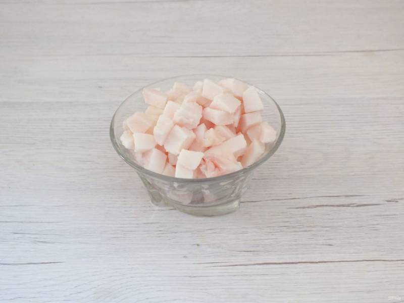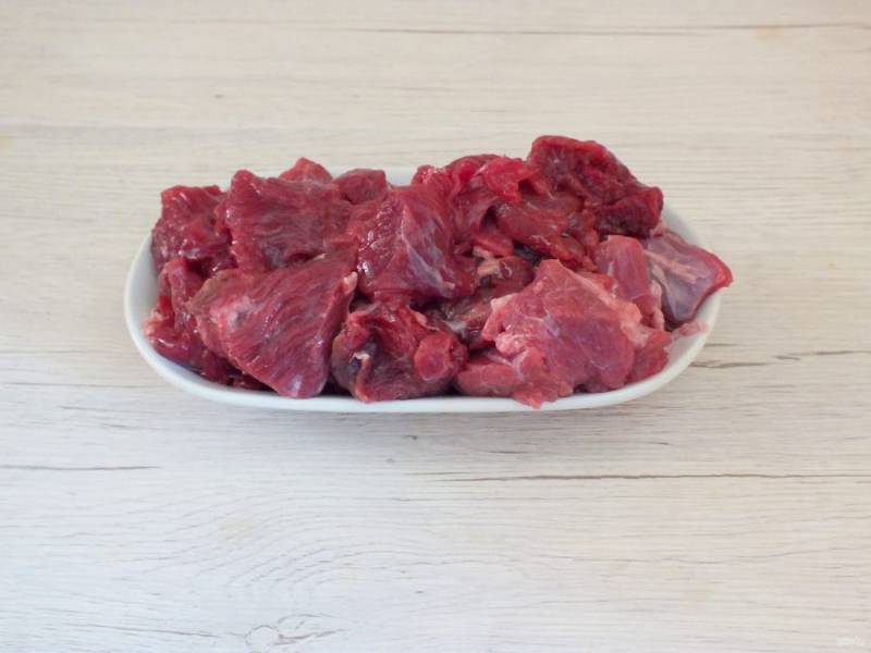 Мясо нарежьте кусочками размером 4 на 4 см.