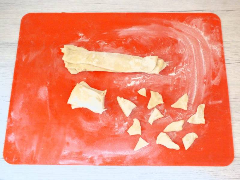 Полосы хорошо присыпьте мукой, выложите друг на друга и нарежьте на треугольники. Также клёцки можно сделать просто отрывая кусочки теста.