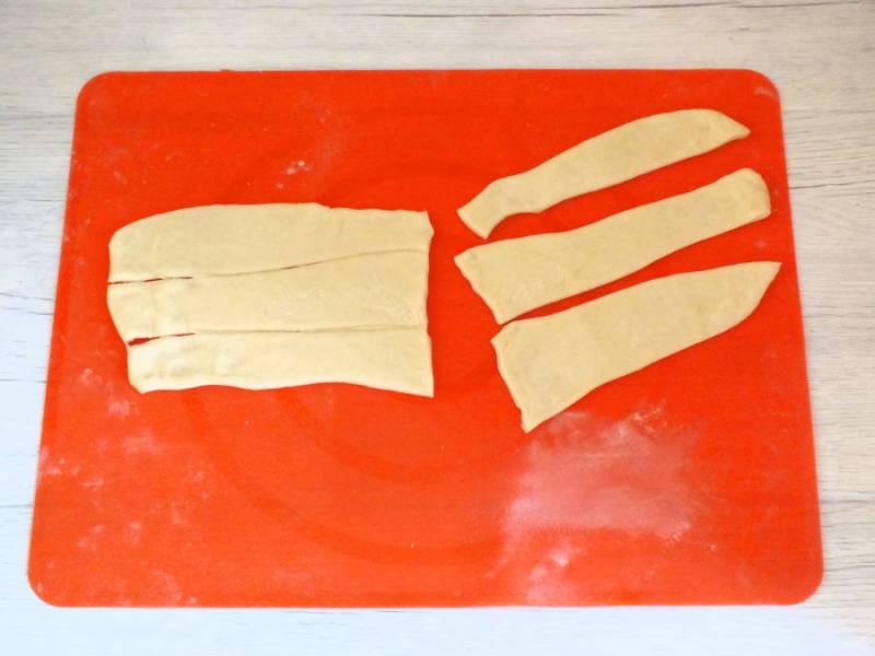 По истечении времени достаньте тесто из холодильника. Раскатайте пласт толщиной 3 мм., разрежьте на полосы.