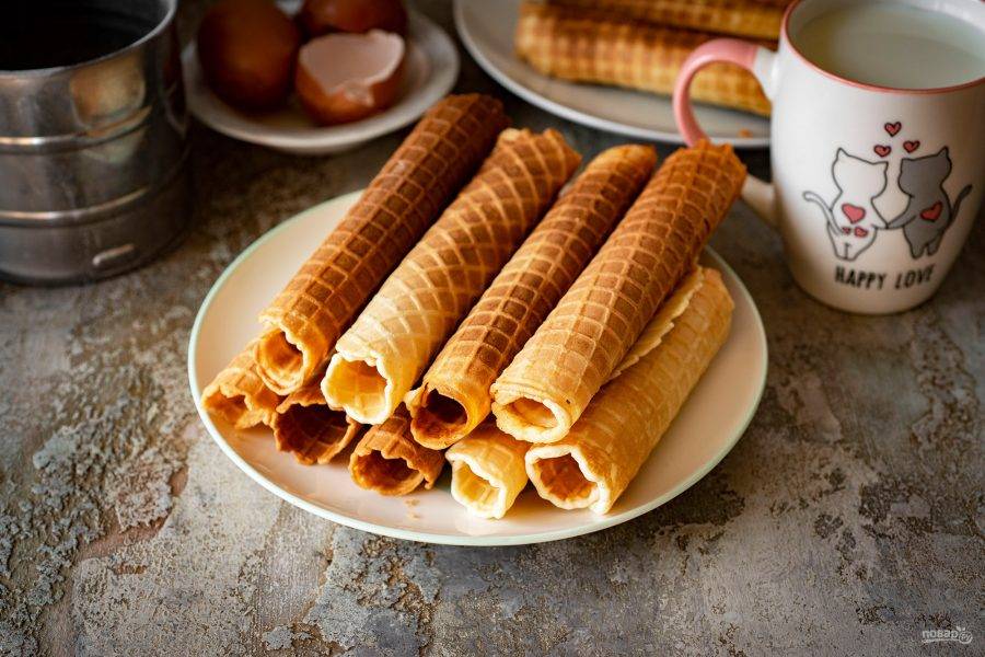 Горячие вафли пока мягкие, поэтому сразу же скатывайте из них трубочки, так как при остывании они становятся хрупкими. Готовые вафельные трубочки подавайте к столу.