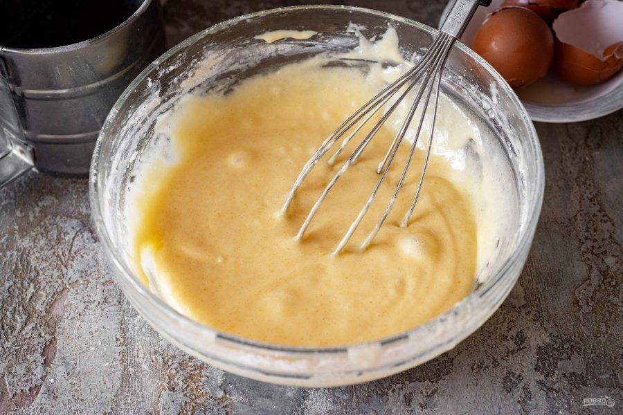Венчиком перемешайте все ингредиенты до получения однородного теста, которое по консистенции напоминает оладьевое.